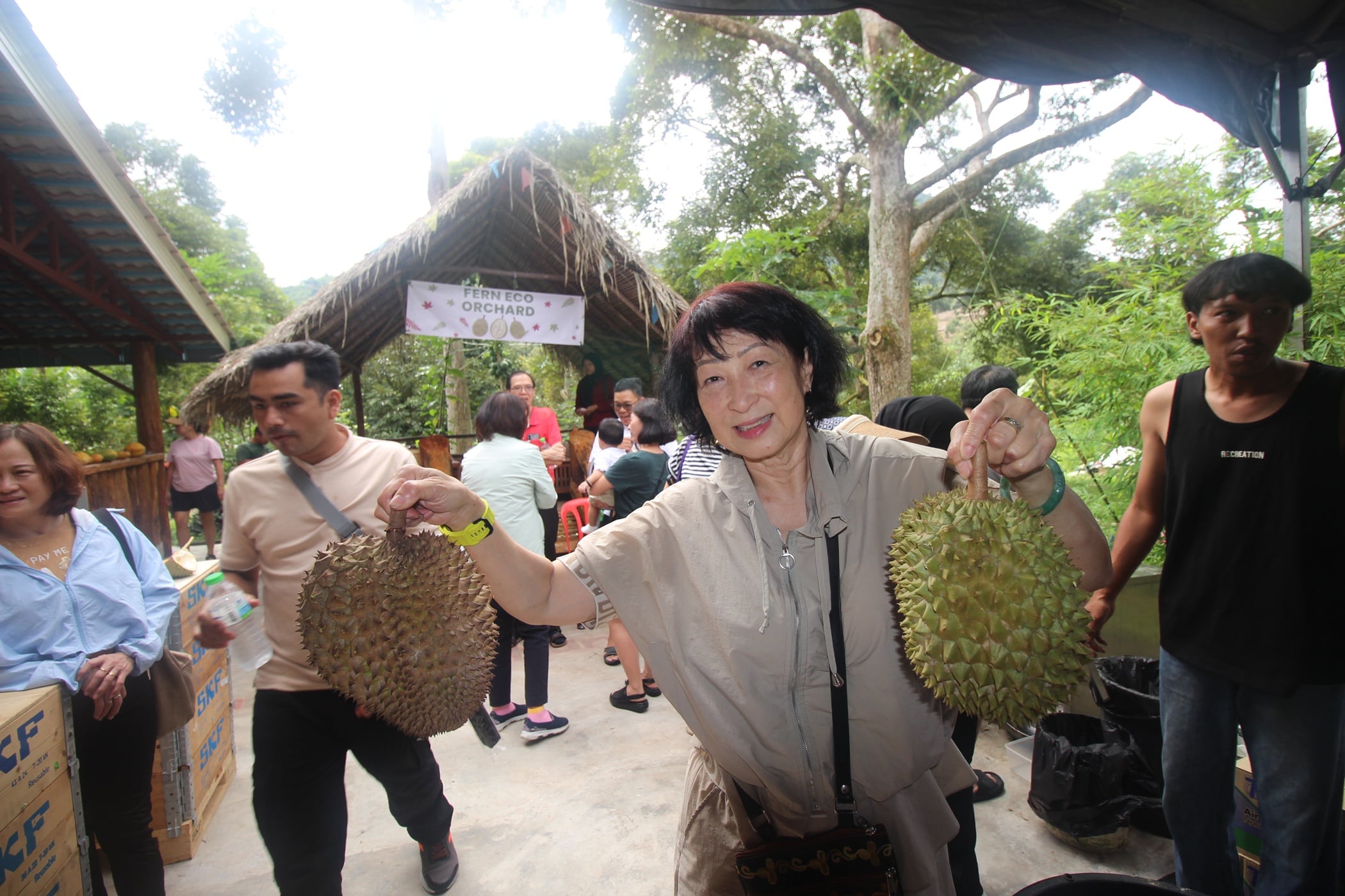 游客走进榴梿园,在大自然的拥抱及凉风吹拂下,一边观赏美景一边品尝榴梿,啜一口茶,享受人生美好时刻。