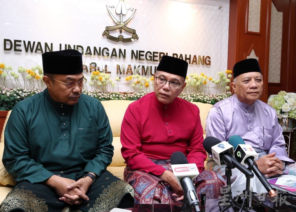旺罗斯迪(中)在彭亨州议长拿督斯里莫哈末沙卡(左)及彭亨州政府财政拿督法兹拉陪同下,召开新闻发布会。 (梁镇强摄)