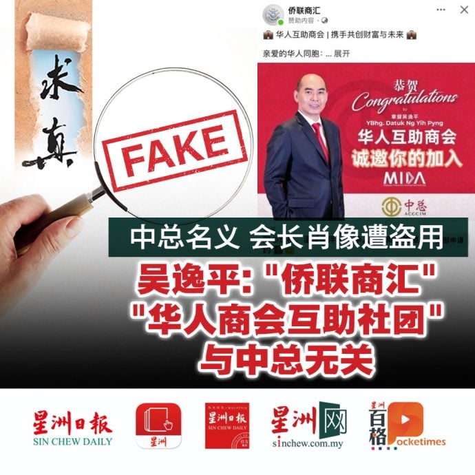针对近日脸书上突然出现的"侨联商汇"及"华人商会互助社团"专页,马来西亚中华总商会(中总)会长拿督吴逸平严正指出,这些皆为假冒网页,与中总、隆雪中总及他本人毫无关联,呼吁民众切勿轻易受骗。