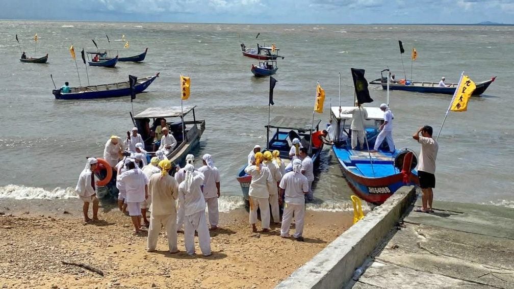 (新加兰23日讯)新加兰路八支齐天大圣府斗姥宫庆祝一年一度的九皇爷宝诞千秋,日前由理事带领信徒到米那务固海边,首次乘坐10艘鱼船出海迎接九皇爷香炉回宫,场面隆重庄严。 当天由该宫主席欧彦东率领“九将十八军”、副主席罗文兴、总务周清池、财政周清平及逾60名信徒参与上述活动。 欧彦东表示,该宫每年农历八月份最后一天,迎接九皇爷香炉回宫供奉及庆祝宝诞千秋后,至农历九月初九晚上才再度恭送回銮大海。 他呼吁善信于农历八月廿九至九月初九,该宫欢庆九皇大帝宝诞期间踊跃参与庆典,该宫每日都备有素食供享用。 他说,10月28日(星期二,九月初八)晚上8时,该宫也扶请九皇大帝驾銮,欢迎各界善信们踊跃参与。