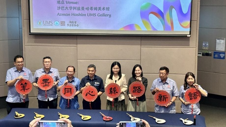(亚庇30日讯)2025年“笔墨同行·丝路新语”马中书法交流展于9月29日下午3时,在沙巴大学阿兹曼哈欣艺廊(Azman Hashim UMS Gallery)揭幕。展览汇集来自中国长沙、内蒙古、西安及马来西亚各地共65位书法家的精心之作,全面呈现跨地域、多元文化交融下的书法艺术风貌。