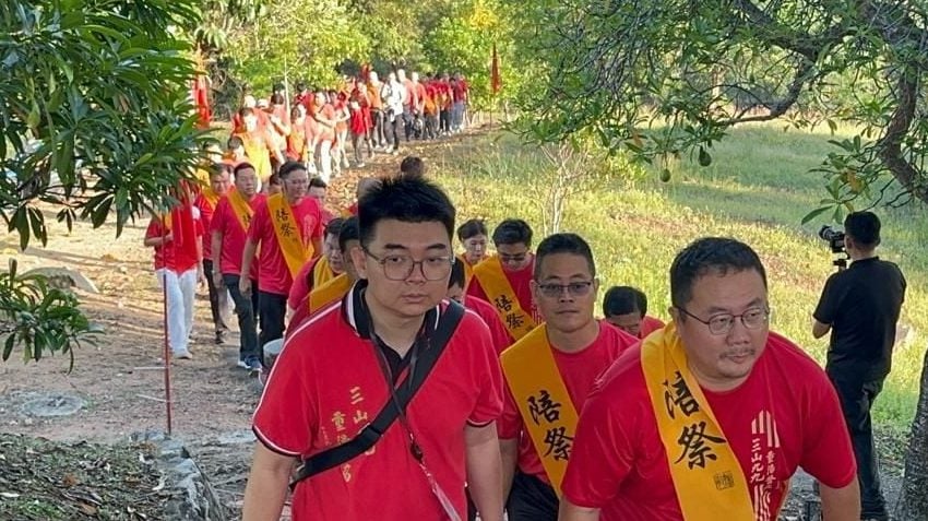 第19届“三山九九•重阳登高”今早在马六甲三宝山展开,让三宝山再现红色人龙环山的壮观场面,并延续中华传统习俗。