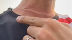 一名摩托车骑士途经甲洞大都会公园外大路时,惨遭空中风筝线勒住颈项,留下一道触目惊心的划痕!