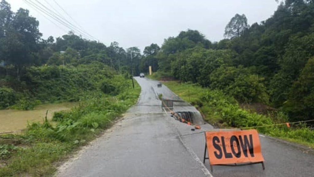连场大雨引发土崩,加帛乡区两条主要道路今早严重塌陷情况,交通受阻,当局已提醒民众行经该路段时务必小心。