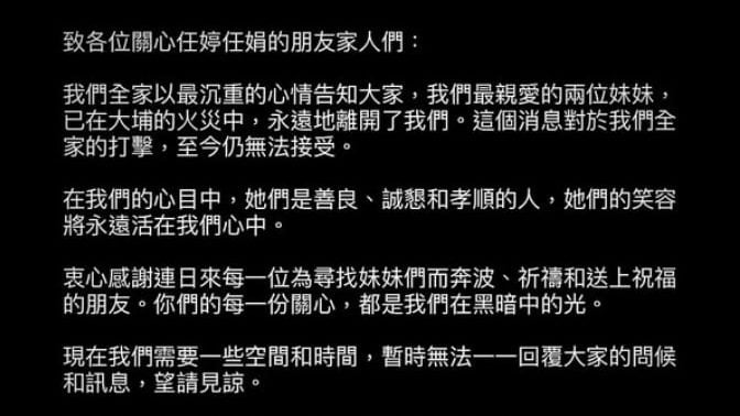 香港著名时装设计师任朗呈(Mountain Yam)周一透过社交媒体证实,他的一对双胞胎妹妹日前于大埔宏福苑发生的五级大火中不幸罹难。
