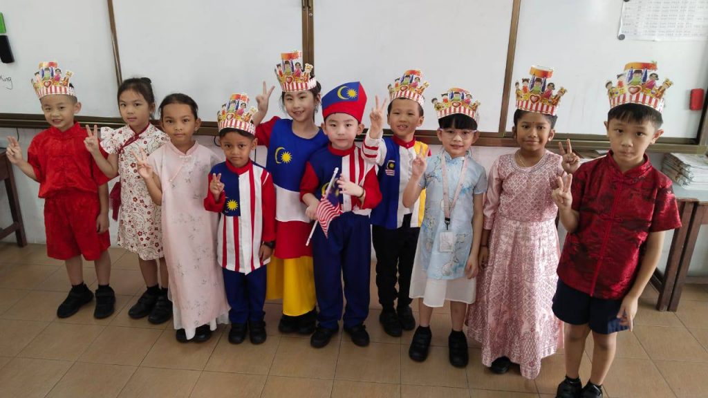 文德甲中华小学(一)校今天举办国庆日活动,师生们穿上各族传统服装,以及辉煌条文的颜色服装,展现出我国多元色彩的美丽一面。