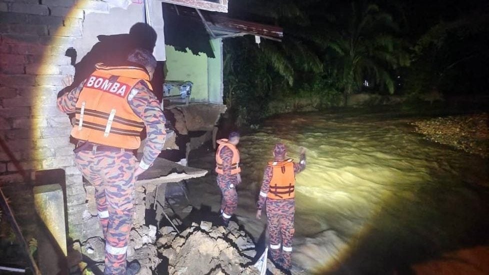 滂沱大雨造成河水暴涨,河边一间民宅的厨房被湍急河水冲塌,所幸屋内一家七口当时身在客厅,逃过一劫。