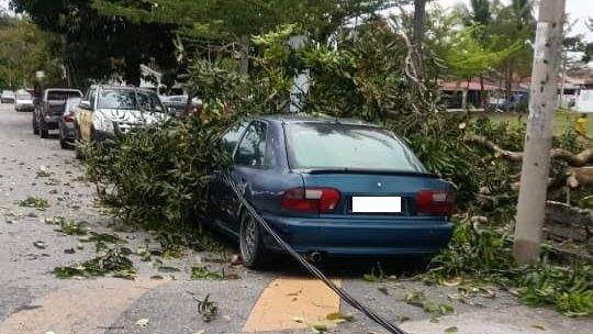 淡马鲁遭狂风暴雨袭击,造成大树倒下压中停放在路旁的轿车,还压扯该路段的国能电线至路面。