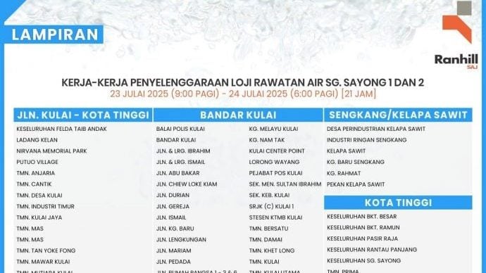 (古来22日讯)双溪沙翁1和2滤水站将进行例常维修,从本月23日上午9时至24日清晨6时,古来与哥打丁宜多个地区水供或受影响长达21小时。 柔佛水务联熹私人有限公司(Ranhill SAJ)宣布以上消息并指出,受影响的地区包括古来往哥打丁宜路、古来市区、新港、加拉巴沙威及哥打丁宜。 除民宅供水受影响外,普陀村、古来警局、古来华小一校、古来火车站、邮政局及新港轻工业区等地亦受波及。 民众受促提前储存足够用水以备不时之需,同时节约用水,避免浪费。若疑问可拨打热线1800-88-7474查询。