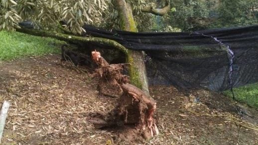 今日下午4时许一场狂风暴雨,劳勿都赖猫山王果园共有16棵榴梿树被狂风连根拔起或揽腰折断,园主损失惨重。