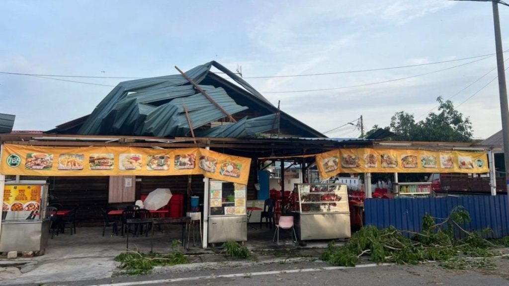 (峇株巴辖2日讯)午后突然来袭的一场狂风暴雨,吹断峇株巴辖中江大路旁多棵大树,断裂的枝干砸中许多房屋与车辆,就连MyKiosk销售亭都被吹到大路的另一端。 中江村长黄贞砖受访时指出,暴风雨于今午4时许突至,中江大路旁有至少四五棵大树被吹断,多个花园住宅区相继传出灾情,其中以茉莉花园情况最严重。 “单单在茉莉花园,就至少有两条路的民宅被断裂的枝干砸中,估计有大约20间民宅遭受到不同程度的破坏,因为电缆也断了,现在整个花园住宅区都没有电。” 一接到村民通知即赶到现场了解情况的黄贞砖透露,中江大路旁的店屋亦同时遭殃。 “被吹断的大树枝干,也砸在轮胎店、摩托车和神料店前,砸坏遮雨棚,也波及至少3辆汽车和三四辆摩托车。” 另一方面,大风也吹翻中江大路旁的小贩摊位、吹动靠近国油加油站的MyKiosk销售亭,造成大路交通出现阻塞。 在暴风雨中,上述销售亭从大路左侧被吹到中江新村所在的右侧,相关视频与照片被上传到社交媒体后,被网民戏谑销售亭也“离家出走”。 不过,庆幸的是,黄贞砖证实,截至目前,并未接获有人在这场风灾中受伤的投报。 他说,接到通知后,警方、消拯局和民防部队都迅速派员到场,协助维持秩序、清理断树与枝干造成的残局。 他透露,他将协助受灾村民,向当局投报及跟进最新情况。同时,他提醒村民在电缆完成修复与电供完全恢复的非常时期,多注意安全。 他说,他之后也会致函公共工程局,要求砍掉或修剪中江大路旁已经长得很高大、茂盛的老树,以免相同情况在未来重演。