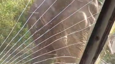 一辆运载甘蔗的卡车停在马路上,一头大象突然迎面冲过来,起脚踩在挡风玻璃试图获取车斗的甘蔗,险些把挡风玻璃踩破,惊险万分!