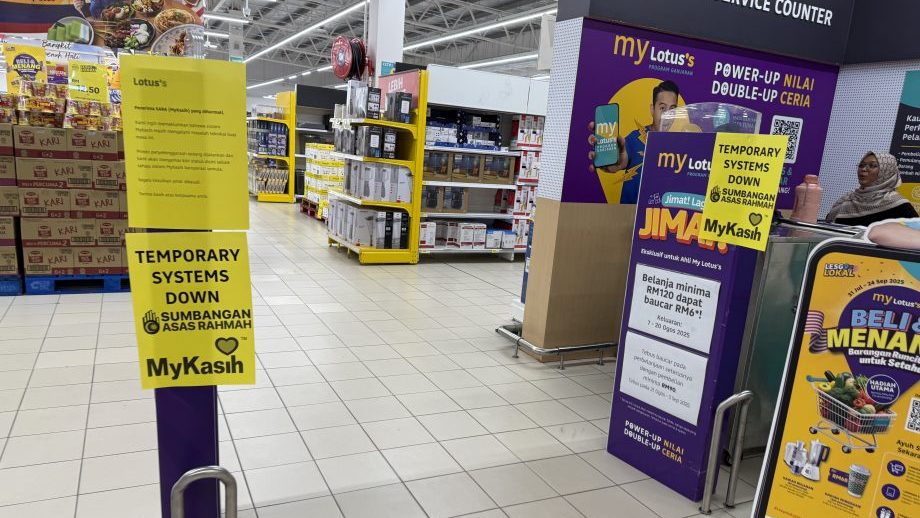 “MyKasih”系统发生故障,北海区霸市及超市直接在入口处张贴告示,以免人们装满物品后却因无法支付而取消交易