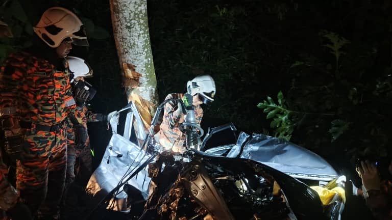 地摩前往打巴路途于凌晨发生一宗涉及1辆轿车及2辆5吨罗里的交通事故,导致一对年约60岁的男女受困车中受伤。