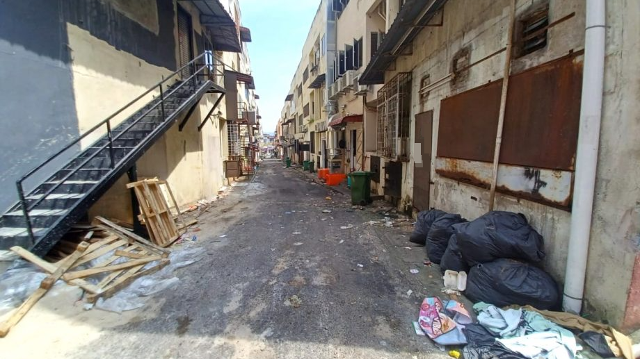 蕉赖皇冠城第9区商业区店屋后巷乱脏臭,后巷沦为非法丢垃圾的地点外,食肆也在后巷煮炊及清洗厨具致使油渍及污水遍地。