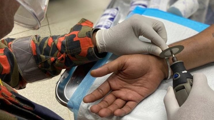 (怡保11日讯)40岁男子手骨折到医院求医,为了作进一步治疗,院方召来消拯员为男子磨断其戴在手上的铁环。 根据怡保消拯局的脸书帖文,于今天深夜12时03分接到怡保苏丹后拜润医院急救部门的求助来电。消防员使用小型切割工具,只费时几分钟就把手环磨断成两截。
